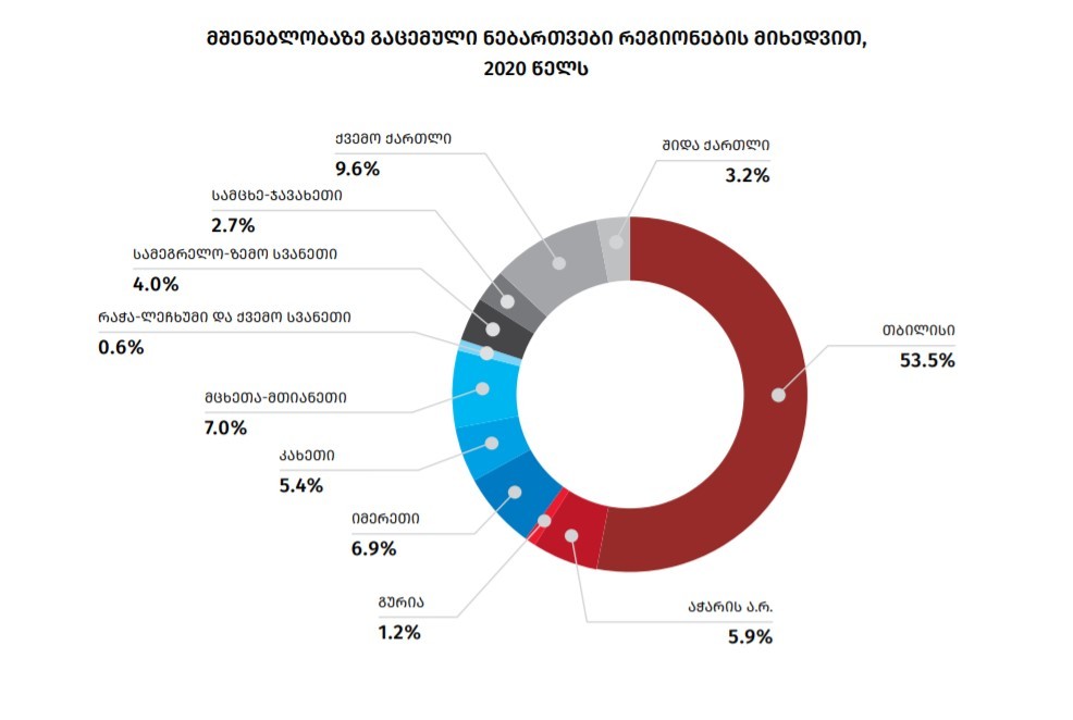 ნებართვების 77,0 პროცენტი მოდის ქვეყნის 4 რეგიონზე. კერძოდ, ჩასატარებელი სამშენებლო სამუშაოების 53,5 პროცენტი ქ. თბილისზე, 9,6 პროცენტი - ქვემო ქართლის რეგიონზე, 7,0 პროცენტი - მცხეთა-მთიანეთის რეგიონზე და 6,9 პროცენტი - იმერეთის რეგიონზე.