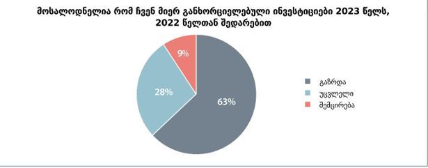 2023 წლის პირველ კვარტალში საქართველოს ბიზნეს ასოციაციის გამოკითხული წევრი კომპანიების 63% აცხადებს, რომ 2023 წელს მათ მიერ განხორციელებული ინვესტიციები 2022 წელთან შედარებით გაიზრდება, 28% უცვლელ დონეზე შენარჩუნებას ვარაუდობს, ხოლო კლებას გამოკითხულთა 9% პროგნოზირებს.