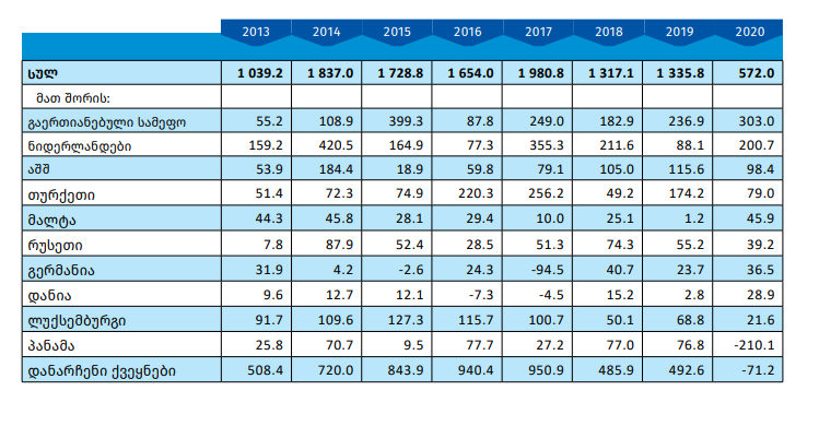დაზუსტებული მონაცემებით, ქვეყანაში 2020 წელს სულ 572 მლნ დოლარის პირდაპირი უცხოური ინვესტიცია შემოვიდა, 57.2%-ით ნაკლები 2019 წელთან შედარებით, 7.3%-ით ნაკლები 2020 წლის წინასწარ მონაცემებზე.