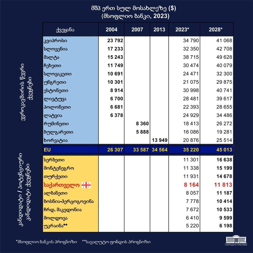 დიაგრამაზე ნაჩვენებია ევროკავშირში გაწევრიანების მომენტში ქვეყნების მთლიანი შიდა პროდუქტი ერთ სულ მოსახლეზე. ბოლო რამდენიმე წლის რეკორდული ეკონომიკური ზრდის შედეგად, საქართველომ უკვე მიაღწია ევროკავშირის წევრობისთვის საჭირო „შესვლის მინიმალურ დონეს“. მსოფლიო ბანკის პროგნოზით კი, საქართველო 2028 წლისთვის ევროკავშირის ასპირანტებს შორის ერთ-ერთი საუკეთესო იქნება.