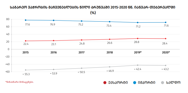 საქართველოს საგარეო სავაჭრო ბრუნვა 2020 წლის იანვარ-თებერვალში 1,853 მლრდ დოლარია 6%-ით მეტი, ვიდრე 2019 წლის ანალოგიურ პერიოდში.
