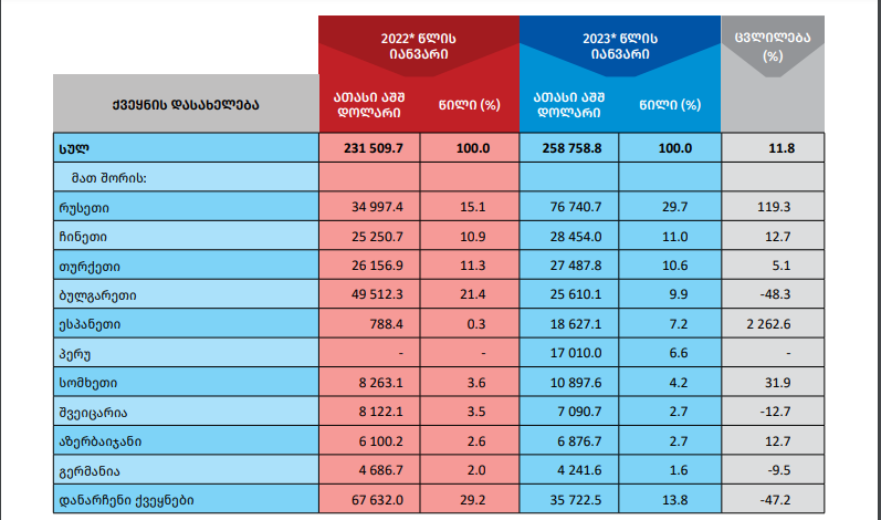 2023 წლის იანვრის მონაცემებით, რუსეთი საქართველოს ნომერ პირველი სავაჭრო პარტნიორი გახდა. სტატისტიკის ეროვნული სამსახურის მიერ გამოქვეყნებული ანგარიშის მიხედვით, 2023 წლის იანვარში ათი უმსხვილესი ქვეყნის წილმა საქართველოს მთლიან ადგილობრივ ექსპორტში 86.2 პროცენტი შეადგინა.
