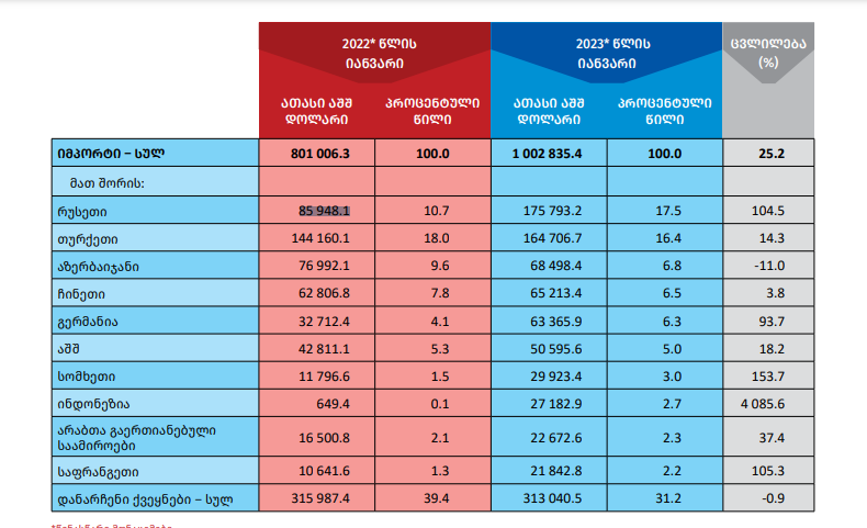 რაც შეეხება იმპორტს, მიმდინარე წლის იანვარში რუსეთიდან საქართველოში 175 793 200 აშშ დოლარის იმპორტი განხორციელდა, გასული წლის ანალოგიურ პერიოდში ეს მაჩვენებელი 85 948 100 აშშ დოლარს შეადგენდა.