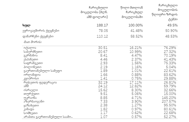 უცხოეთიდან საქართველოში ფულადი გზავნილების 94.7% იმ 19 უმსხვილეს პარტნიორ ქვეყანაზე მოდის, საიდანაც ასეთი გზავნილების მოცულობამ მარტში 1 მლნ დოლარს გადააჭარბა. იმავე 19 ქვეყანაზე გასული წლის მარტში მთელი ფულადი გზავნილების 94.8% მოდიოდა.