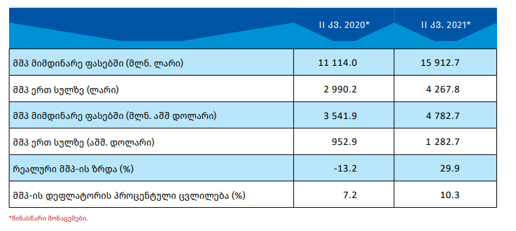 საქსტატის მონაცემებით, 2021 წლის მეორე კვარტალში მშპ-მ ერთ სულ მოსახლეზე 4 267 ლარი შეადგინა, 1 277 ლარით მეტი, ვიდრე 2020 წლის ანალოგიურ პერიოდში. დოლარში მაჩვენებელი 2020 წლის მეორე კვარტალთან შედარებით 953 დოლარიდან 1 282 დოლარამდე გაიზარდა.