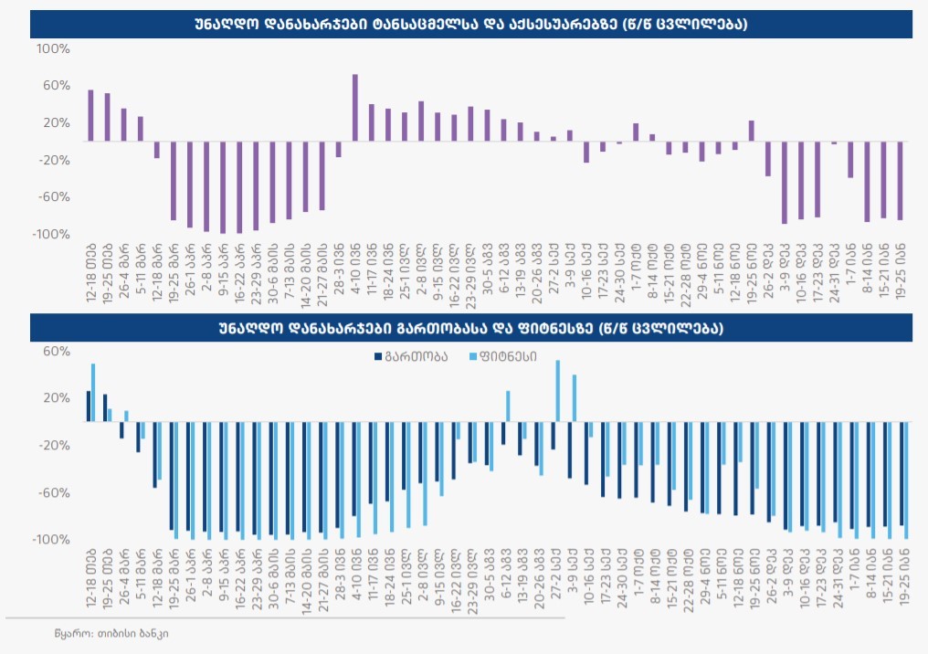 ბოლო ოთხი თვის განმავლობაში, უნაღდო დანახარჯები გართობაზე და ფიტნესზე მინიმალურ ნიშნულზეა.თიბისი კაპიტალის კვლევის მიხედვით, ტანსაცმელზე უნაღდო ხარჯვის ზრდის ტემპი განაგრძობს მკვეთრ შემცირებას და 19-25 იანვრის პერიოდში წ/წ -85% შეადგინა, რაც განპირობებულია დროებითი დახურვით.