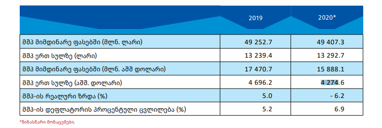 პანდემიურ წელს საქართველოში მშპ ერთ სულ მოსახლეზე დოლარში შემცირებულია. ლარის შემთხვევაში წლიური მატება 53 ლარია, თუმცა დოლარის შემთხვევაში კი ვარდნა 422 დოლარს აღწევს, რაც ლარის გაუფასურებით აიხსნება.