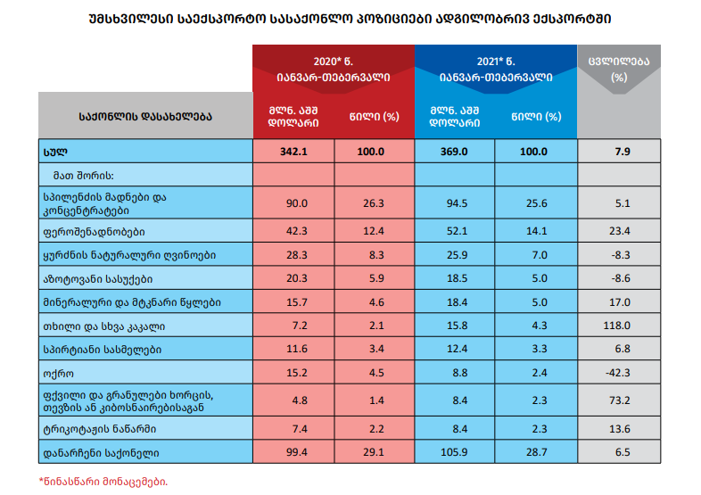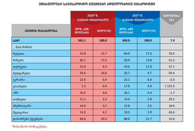 2021 წლის იანვარ-თებერვალში ათი უმსხვილესი ქვეყნის წილმა საქართველოს მთლიან ადგილობრივ ექსპორტში 78.3 პროცენტი შეადგინა.