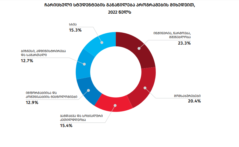 უწყების ინფორმაციით, 2022 წელს პროფესიულ საგანმანათლებლო დაწესებულებებში 14 103 სტუდენტი ჩაირიცხა, რომელთაგან 46.6 პროცენტი ქალია, ხოლო 53.4 პროცენტი - კაცი. 2021 წელთან შედარებით სტუდენტების მიღების მაჩვენებელი გაზრდილია 25.9 პროცენტით.