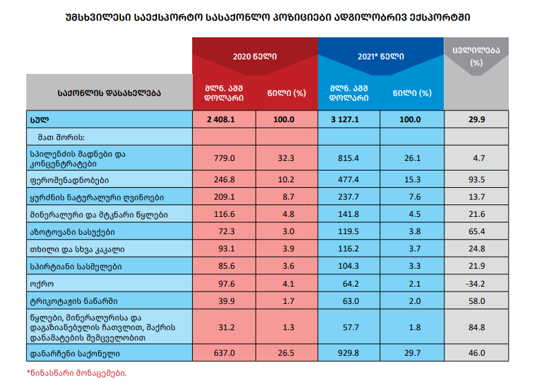 მთლიანობაში 2021 წელს საქართველოდან ექსპორტირებულია 4.242 მლრდ დოლარის პროდუქცია, ეს 27%-ით მეტია 2020 წელთან შედარებით.