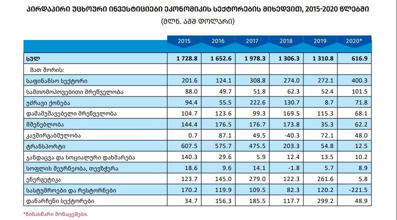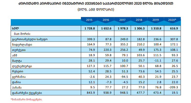 საქართველოში განხორციელებული პირდაპირი უცხოური ინვესტიციების მოცულობამ 2020 წელს 616.9 მლნ დოლარი შეადგინა, რაც 52.9%-ით ნაკლებია 2019 წლის დაზუსტებულ მონაცემებზე.