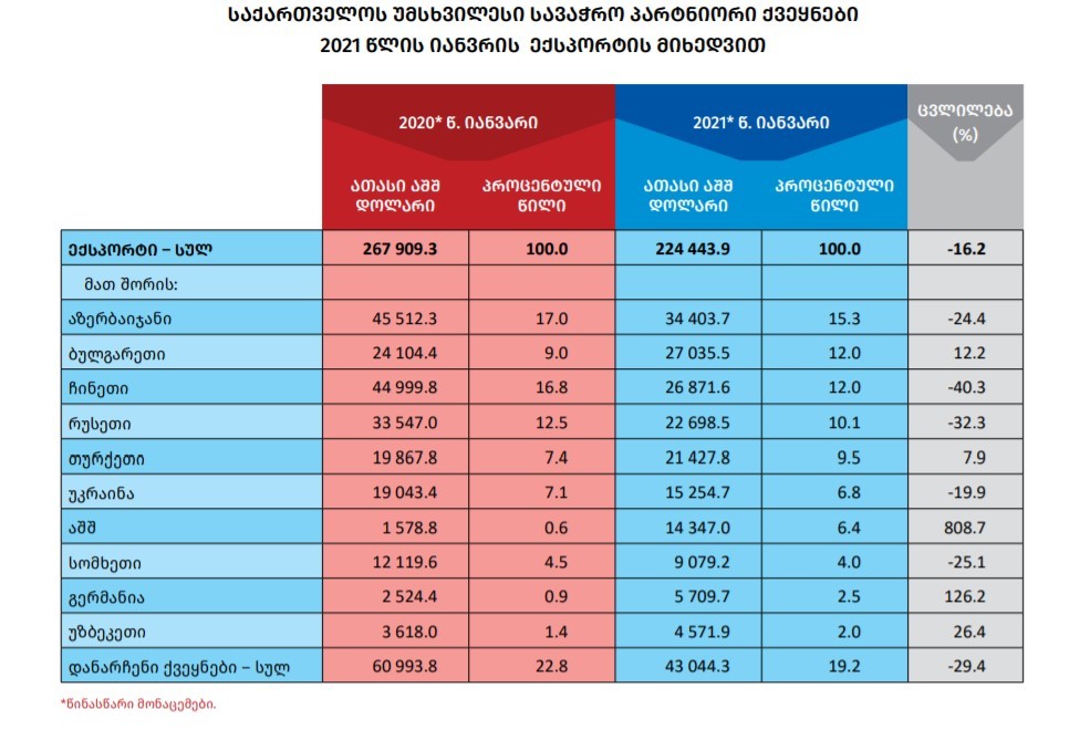 2021 წლის იანვარში ათი უმსხვილესი საექსპორტო ქვეყნის წილმა საქართველოს მთლიან ექსპორტში 80.8 პროცენტი შეადგინა. უმსხვილესი საექსპორტო სამეული შემდეგნაირად ჩამოყალიბდა: აზერბაიჯანი (34.4 მლნ. აშშ დოლარი), ბულგარეთი (27.0 მლნ. აშშ დოლარი) და ჩინეთი (26.9 მლნ. აშშ დოლარი).