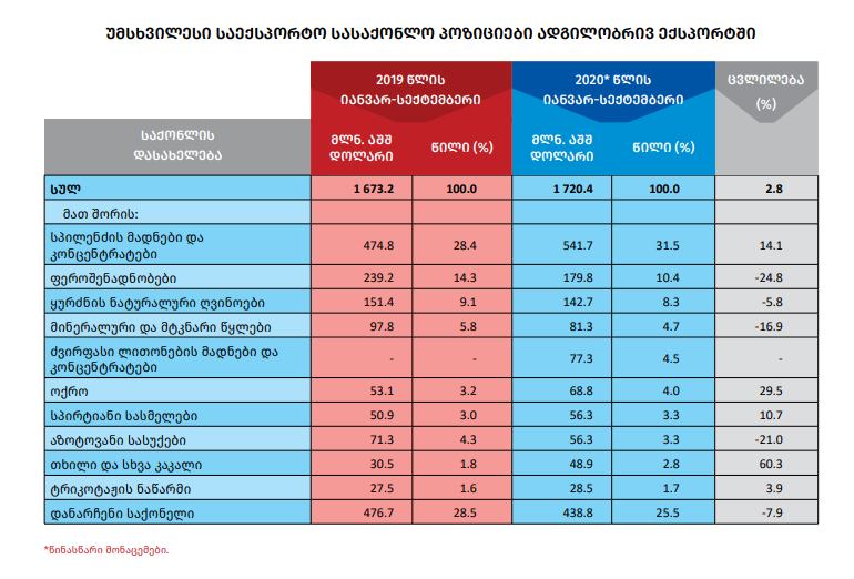რაც შეეხება 2020 წლის იანვარ-სექტემბერს საქართველოდან ექსპორტის მოცულობამ (არადეკლარირებული ექსპორტის გარეშე) 2,403 მლრდ დოლარი შეადგინა, რაც 12.1%-ით ნაკლებია გასული წლის შესაბამისი პერიოდის მაჩვენებელზე.
