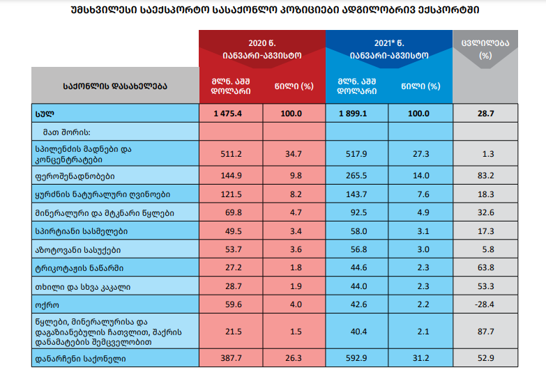 საქსტატის მონაცემებით, 2021 წლის იანვარ-აგვისტოში რეექსპორტთან ერთად 2.61 მლრდ დოლარი შეადგინა, წლიურად მაჩვენებელი გაზრდილია 26%-ით.