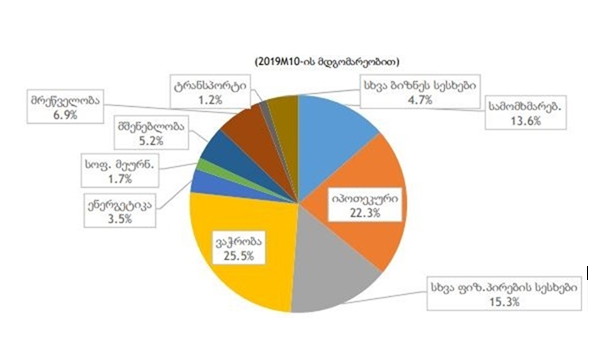 საცალოს ანალოგიურად დიდი ცვლილებები არც კორპორატიულ სექტორშია. იურიდიული პირების დეკრედიტებაში კვლავ დომინანტია ვაჭრობა, 25.2% წილით (2019M10 -25.3% ).
